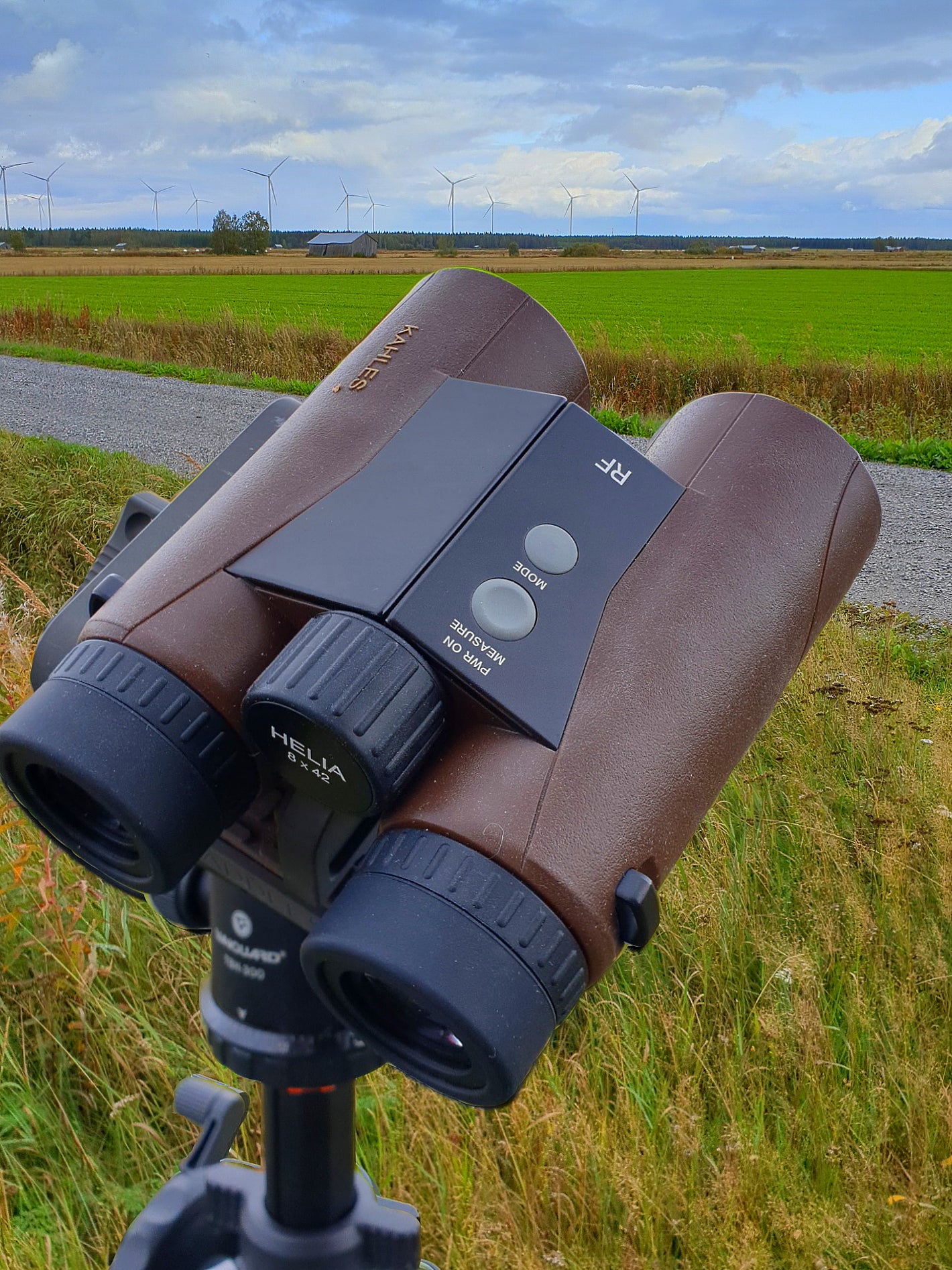 Kahles Helia- series binoculars with integrated laser range finder. See laser performance test video below. Laser has "scan mode" for continuous measurement and "EAC" mode for uphill/downhill true ballistic distance.
