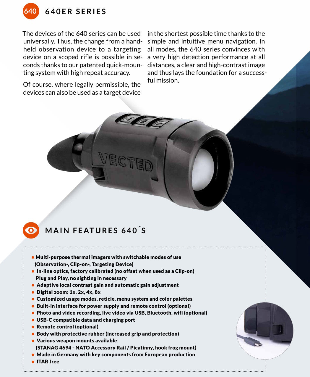 - Välittömästi käyttövalmis clip-on laitteeksi, käsikatseluun tai erilliseksi tähtäimeksi -lisäosia tai varusteita ei tarvita. Laite vaihtaa operointimoodia automaattisesti. (toimitus sisältää STANAG 4649 NATO RAS smart mountin)