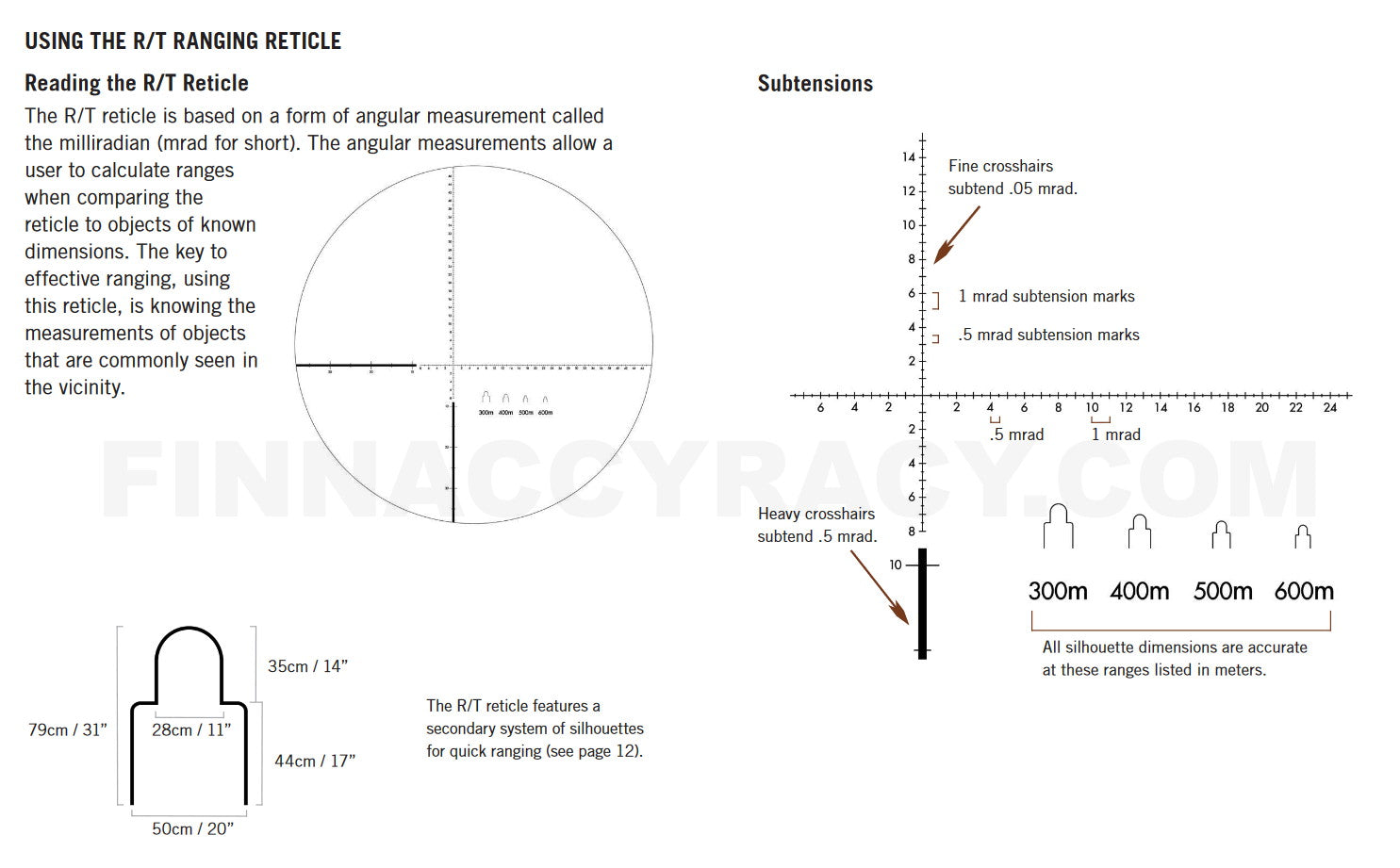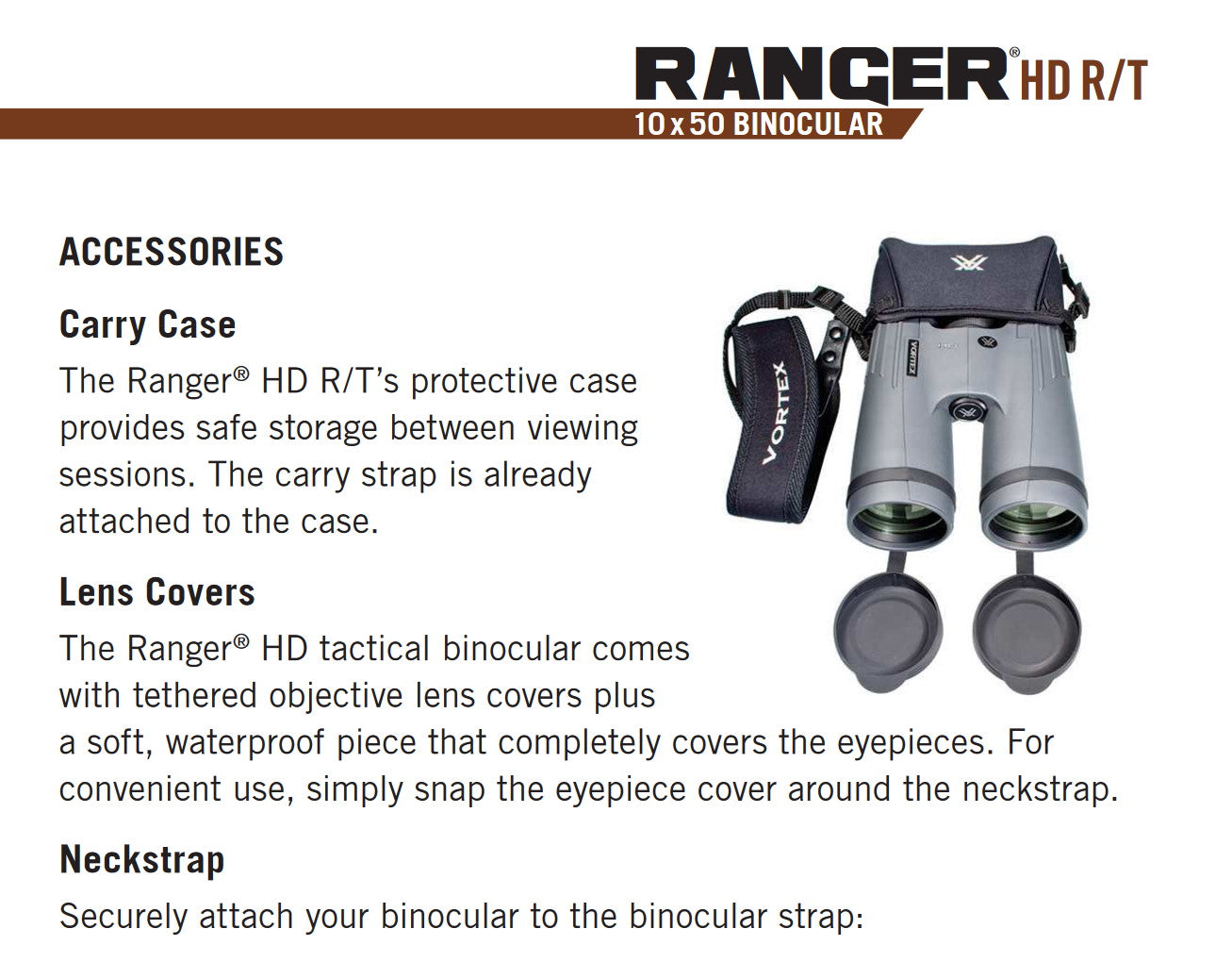 The Ranger HD R/T tactical binocular combines premium optics and tactical features to create a tough, durable roof prism binocular-reliable in all conditions. HD (High Density, extra-low dispersion glass) objective lenses deliver impressive resolution and the true-to-life color accuracy essential for identifying targets at long distances in low light. Law enforcement and hunters can range objects of known dimension with the R/T Ranging reticle, which features four silhouettes to serve as a secondary ranging aid.