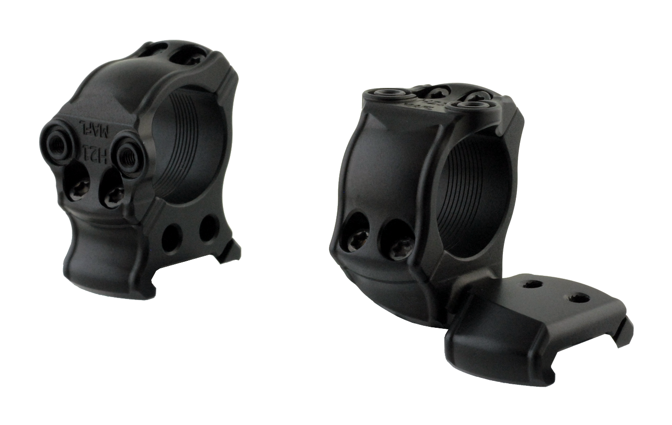 Aesthetic hunting rings for 1" tube on Picatinny and Weaver bases/rails. Features one standard ring and one cantilever ring for use on long action rifles, and two Spuhr Interface top covers for attaching accessories.