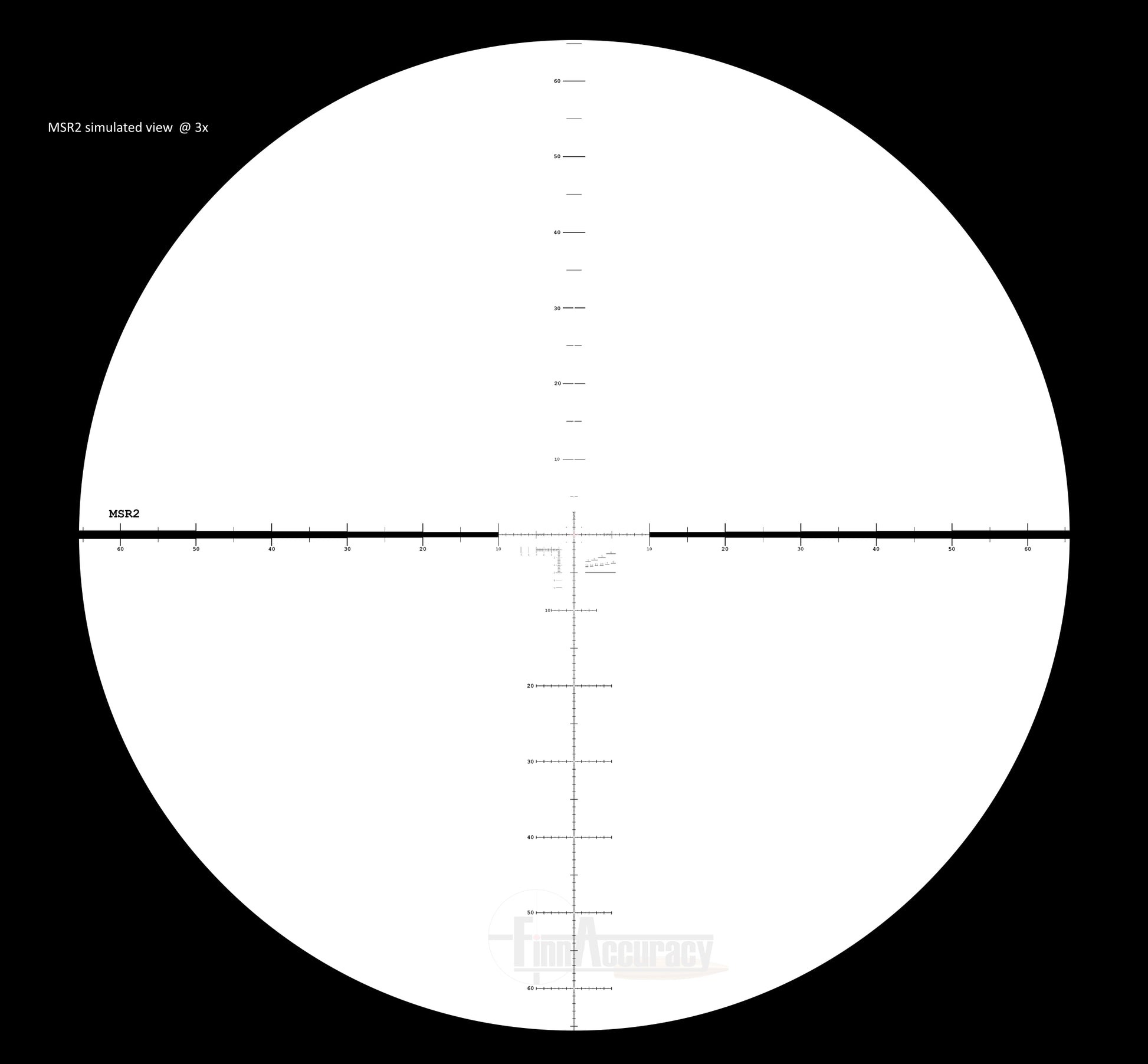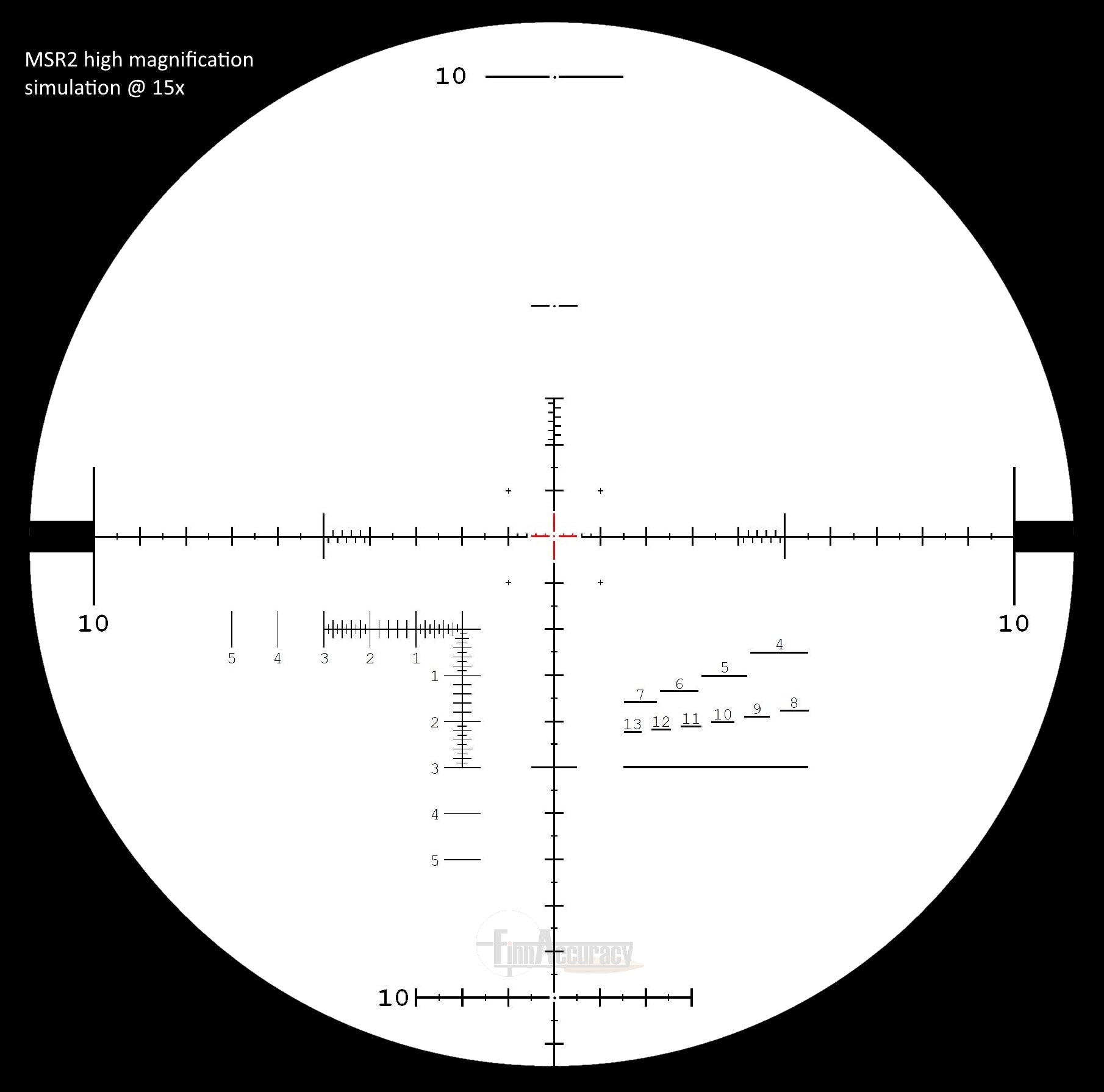 Huom! Alkuperäinen MSR-ristikko on suunniteltu 5-25 suurennosalueelle. 3-15x suurennosaluetta varten MSR-mittoja on skaalattu parhaan käytettävyyden varmistamiseksi. Tärkein muutos on hiusviivan kasvanut paksuus 0.05=>0.06mrad sekä erottuvuuden varmistamiseksi vahvennettu stadiametri-asteikko.